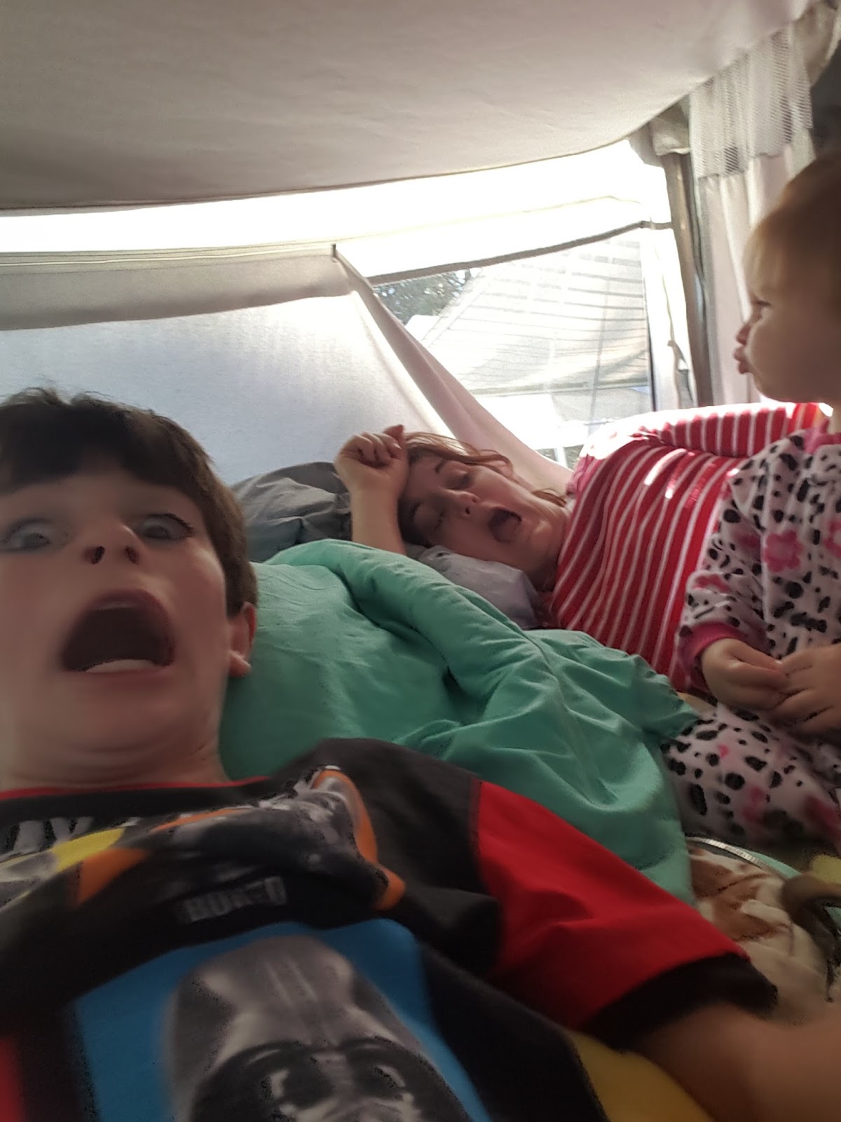 We had Trev and Lincoln sleep with us in the tent trailer. Slumber party!!! By morning, Lincoln had his own bed as all other 3 had migrated to Trev's space. ;)